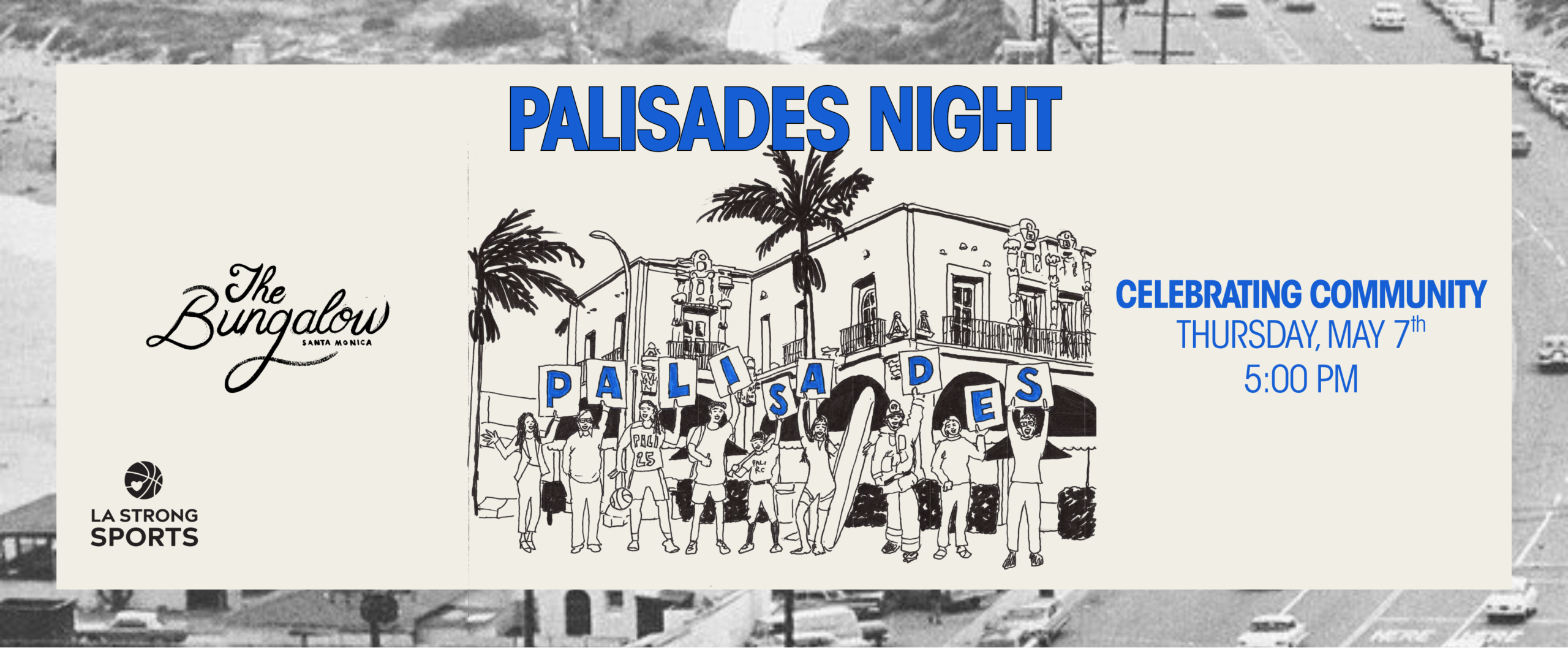 Benefiting LA Strong Sports with 100% of proceeds supporting the rebuild of the Pacific Palisades Park and Recreation Center, featuring specials on Palisades food and drink staples, themed merch, prizes, a local celebrity emcee, and sounds by Pali native DJ Graham Funke.